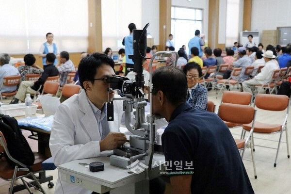 24일 전남 장흥군은 안양면 다목적회관에서 서울대학교병원과 NH농협생명 주관으로 서울대학교병원 의료진과 봉사단 40여명이 참가한 가운데 ‘농촌순회 무료진료’를 개최했다. 사진은 한 주민이 안과 진료를 받고 있는 모습.(사진제공=장흥군청)