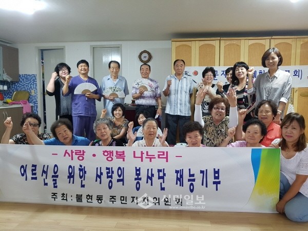 25일 경기 동두천시 불현동 주민자치위원회에서는 상우아파트 경로당을 찾아 '사랑의 봉사단'을 운영했다. 사진은 봉사에 참여한 관계자들이 기념촬영을 하는 모습.(사진제공=동두천시청)