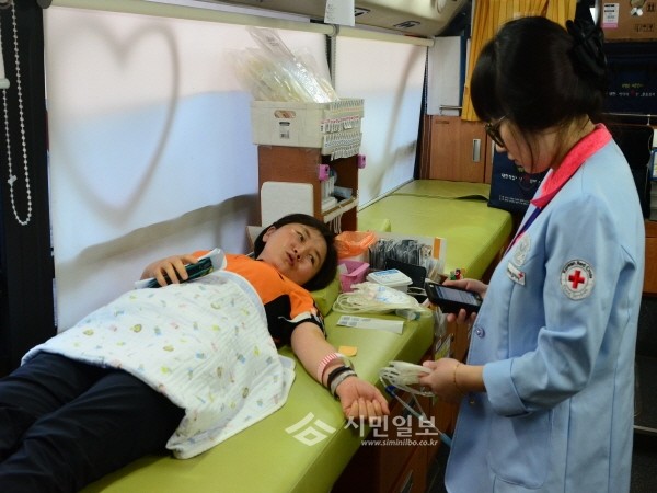 26일 서울 영등포소방서는 대한적십자사 서울서부혈액원 차량에서 진행된 사랑의 헌혈 운동에 동참했다. 사진은 이날 참여한 소방서 관계자가 헌혈하는 모습.(사진제공=영등포소방서)