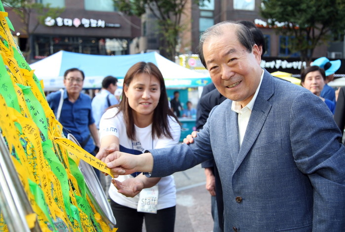 최근 마포구 서교동 홍대앞걷고싶은거리에서 '활력, 홍대앞! 극복, 젠트리피케이션!'이라는 슬로건으로 '2016 잔다리마을 문화축제'가 열렸다. 사진은 박홍섭 구청장이 축제의 성공 기원 메세지를 담은 리본을 매달고 있는 모습.(사진제공=마포구청)