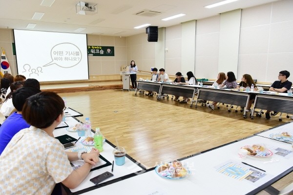 최근 경기 안산시가 한양대학교 에리카캠퍼스 학생 20명을 시의 다양한 행사와 홍보와 콘텐츠 발굴 등을 하게 될 ‘1기 SNS 대학생 서포터즈’로 위촉했다. 사진은 1기 서포터즈 학생들이 워크숍에 참석해 기사작성법에 대한 강의를 듣는 모습.(사진제공=안산시청)