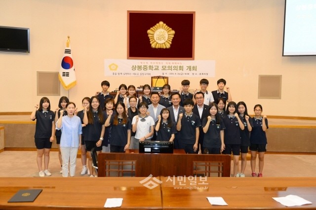 학생들은 '교복 바르게 입기 실천', '청소년 체육시설 확대에 관한 건의안', '선말선플 운동 실천' 등에 대한 안건을 상정하고 토론을 이어갔으며 5분 자유발언을 끝으로 모의의회를 마쳤다.