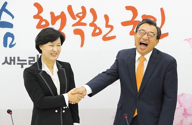 새누리당 이정현 대표(오른쪽)와 더불어민주당 추미애 대표가 29일 오전 국회에서 만나 서로의 당선을 축하하는 악수를 하며 활짝 웃고 있다.