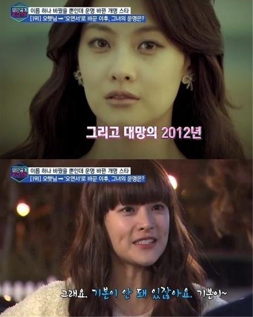 이에 대해 성명학자는 “오햇님이라는 이름을 쓸 때는 좋은 기운들이 많이 부족해있었는데 오연서로 바꾸면서 능력이나 풍파, 재물 이런 것들이 다 제자리를 잡았다”고 설명했다.