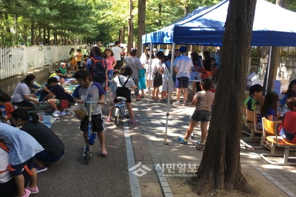 지난 27일 경기 수원시 권선구 곡선동은 곡반초등학교 앞 가로수길에서 '청소년 알뜰 벼룩시장'을 개최했다. 사진은 벼룩시장에 참여한 주민 및 어린이들이 물품을 고르는 모습.(사진제공=권선구청)