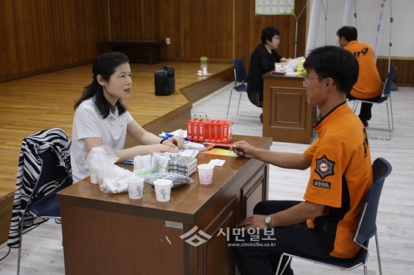 30일 인천 부평소방서는 직장내 금연분위기 조성을 위해 3층 강당에서 금연을 희망하는 흡연자를 대상으로 부평보건소와 합동으로 '금연클리닉'을 운영했다. 사진은 보건소 관계자가 소방관과 상담하는 모습.(사진제공=부평소방서)