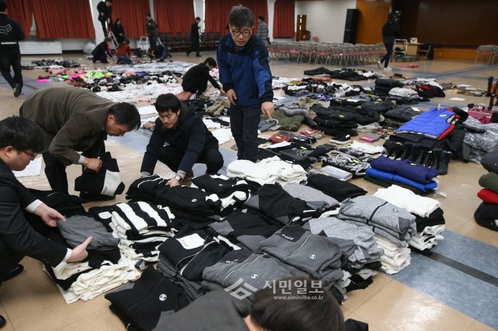 | ▲ 지난해 2월 검찰 송치 전 관계자들이 짝퉁상품들을 분류하고 있다.(사진제공=중구청) | ||