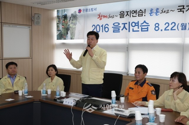 | ▲ 서울 은평소방서 을지훈련 상황실을 방문한 성흠제 은평구의장(가운데)이 회의실에서 인사말을 전하고 있다.(사진제공=은평구의회) | ||
