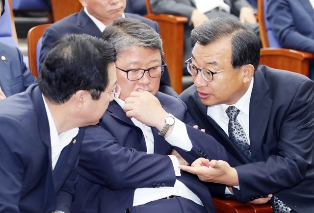 새누리당 이정현 대표(오른쪽)가 30일 오전 국회에서 열린 의원총회에서 조원진(가운데), 이장우 최고위원과 얘기를 나누고 있다. 새누리당은 야당이 추경안 심사 과정에서 당초에 합의 내용에 없었던 교육 부문 및 개성공단 피해 지원과 관련한 예비비 증액을 요구하고 있다고 지적한 뒤 강하게 반발하고 있다.