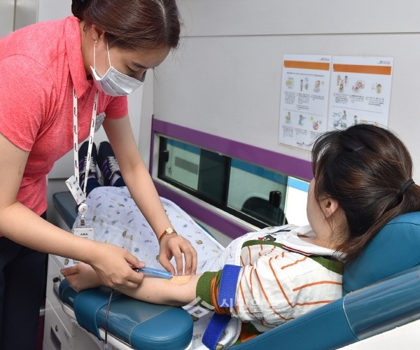 지난 30일 서울 노원구는 구청 직원 130여명이 참여한 가운데 동부혈액원과 함께하는 '3분기 헌혈을 통한 사랑나눔' 행사를 구 보건소 앞에서 실시했다. 사진은 한 직원이 헌혈을 하고 있는 모습.(사진제공=노원구청)