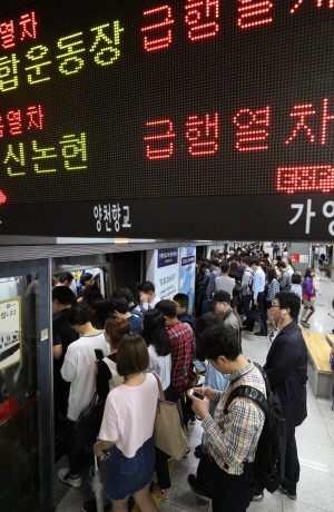 지하철 9호선 최대혼잡 구간(가양∼신논현)에 셔틀형 급행열차가 투입된 31일 오전 서울 강서구 가양역에서 출근길에 오른 시민들이 열차를 타고 있다.다. 이날부터 운행을 시작한 셔틀형 급행열차의 출발시각은 가양역 기준 오전 7시 45분, 오전 7시 53분, 오전 8시 1분, 오전 8시 9분이다