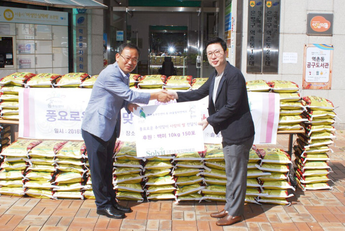 최근 서울 은평구에 위치한 기업인 (주)솔빛피앤에프에서는 추석을 맞이해 역촌동과 갈현2동 주민센터에 각각 쌀 1500kg(10kg·150포)을 기증했다. 사진은 역촌동 주민센터에서 전달식을 마치고 관계자들이 기념촬영을 하는 모습.