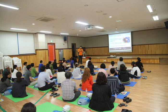 지난 31일 오후 3시 동작소방서는 상현초등학교에서 교사 50명을 대상으로 소방안전교육을 실시했다. 사진은 소방서 관계자가 참여자들에게 심폐소생술 교육을 하는 모습.(사진제공=동작소방서)