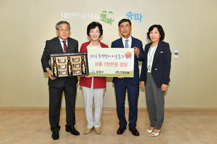 지난 31일 박춘희 송파구청장은 (주)기창건설로부터 추석맞이 이웃돕기 후원성품(1000만원 상당)을 전달받았다. 사진은 박 구청장(왼쪽에서 두번째)과 관계자들이 기념촬영하는 모습.(사진제공=송파구청)
