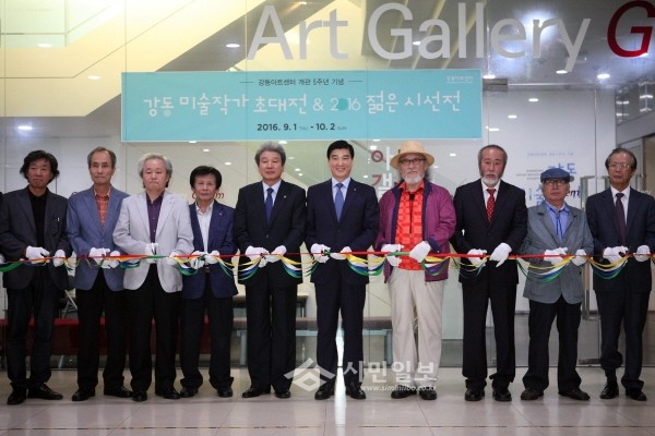 1일 서울 강동구는 강동아트센터에서 열린 개관 5주년 기념을 기념해 '강동 미술작가 초대전 및 2016 젊은 시선전'을 개최했다. 사진은 이해식 구청장(오른쪽에서 다섯번째)이 관계자들과 리본 커팅을 하는 모습.(사진제공=강동구청)