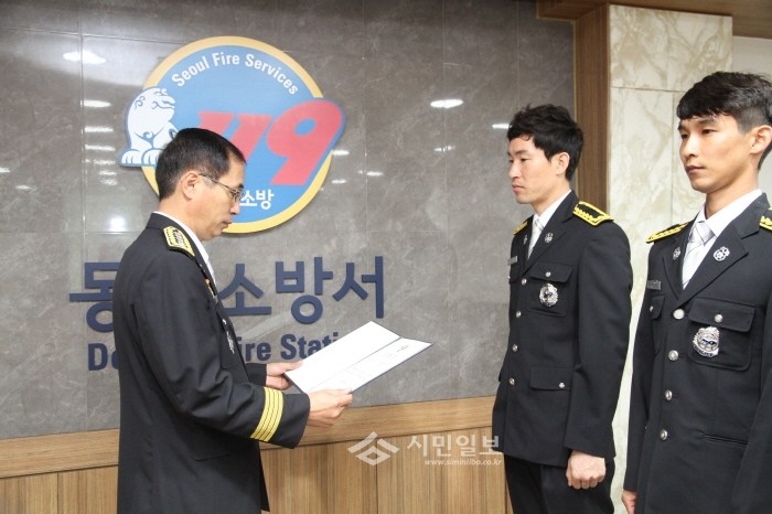 지난 1일 서울 동작소방서는 2층 소회의실에서 승진한 소방공무원에 대한 임용신고를 실시했다. 사진은 박찬호 서장이 승진자들에게 임용장을 수여하는 모습.(사진제공=동작소방서)