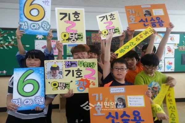 1일 경북 구미시 옥계초등학교는 2016학년도 2학기 전교어린이회 임원 선거를 실시했다. 사진은 선거 운동을 하는 학생들이 선거포스터를 들고 기념촬영을 하는 모습.(사진제공=구미교육지원청)