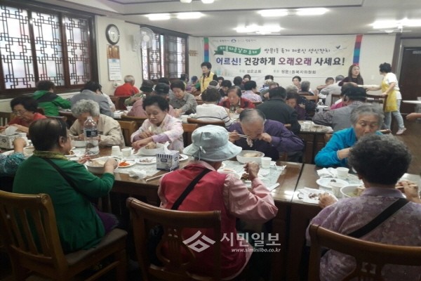 최근 서울 도봉구의 민간복지거점기관인 쌍문1동 성은교회는 지역내 홀몸노인 60여명을 초청해 생일잔치 '아름다운 날의 초대'를 개최했다. 사진은 노인들이 삼계탕 식사를 하고 있는 모습.(사진제공=도봉구청)