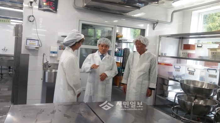 지난 1일 전남 광양교육지원청 임원재 교육장은 부임후 첫 행보로 광양북초등학교 및 광양중학교를 방문했다. 사진은 임 교육장(가운데)이 학교 관계자들과 급식 위생 관리의 중요성에 대한 이야기를 나누는 모습.(사진제공=전남도교육청)
