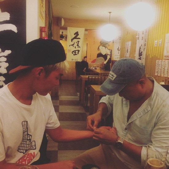 허지웅은 자신의 SNS에 ‘창욱이 귀여워’라는 제목의 사진을 공개했다. 사진 속에서는 정창욱 셰프가 허지웅의 손목에다가 무언가를 차고 있는 모습이다.