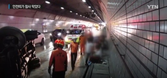 지난 2일 오전 10시 59분께 부산 기장군 곰내터널 입구를 들어선 유치원 버스 차량이 빗길에 미끄러져 터널 충돌방지턱을 들이받고 넘어졌다.
