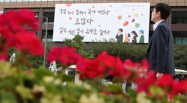 5일 오전 서울 광화문 교보생명빌딩에 '광화문글판' 가을편이 걸려 있다. 이번 문구는 김사인 시인의 시 '조용한 일'에서 발췌한 문안으로 무심코 지나쳤던 평범한 풍경이 때로는 위안이 되듯 일상 속의 소소한 것들을 소중히 여기고 감사하며 살아가자는 뜻을 담고 있다.