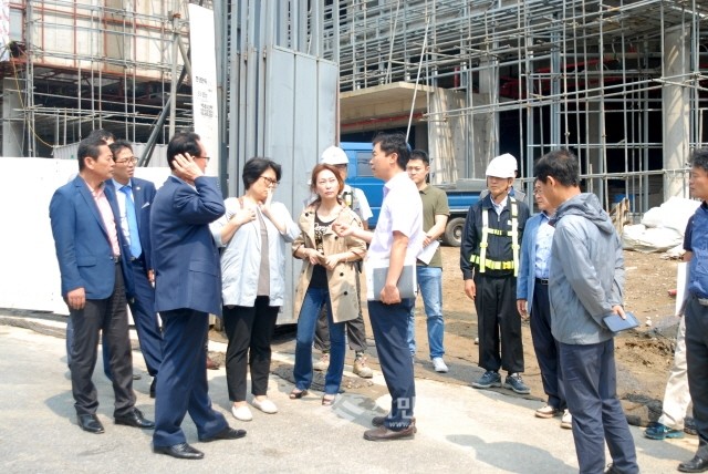 | ▲ 임시회 기간 중에 사당종합체육관 공사 현장을 방문한 동작구의회 행정재무위원회 위원들이 현장을 살펴보며 이야기를 나누고 있다.(사진제공=동작구의회) | ||