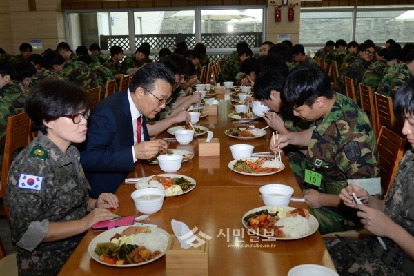 최근 인천 연수구 기동대와 여성예비군 소대는 구청 구내식당에서 2016 을지프리덤가디언(UFG) 향방작계 급식지원훈련을 실시했다. 사진은 이날 훈련장소를 찾은 이재호 구청장이 예비군들과 함께 식사하는 모습.(사진제공=연수구청)