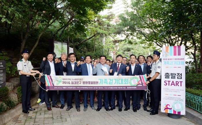 최근 동대문구는 배봉산 근린공원 일대에서 민주평화통일자문회의 동대문구협의회 주최로 ‘2016년 평화통일 염원 가족 걷기대회’ 행사를 개최했다. 사진은 유덕열 구청장(앞줄 가운데)과 관계자들이 기념촬영하는 모습.(사진제공=동대문구청)