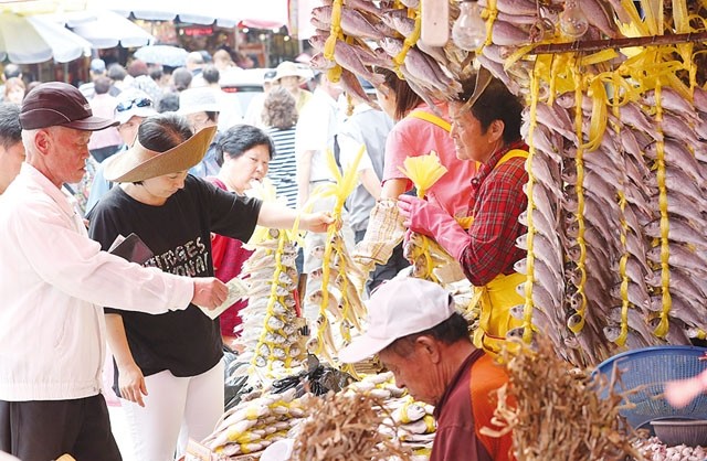 6일 오후 서울 동대문구 경동시장에 추석을 맞아 굴비 등 제수용품을 구입하려는 시민들로 북적이고 있다. 한국농수산식품유통공사(aT)는 전국 곳곳에 있는 전통시장 16개와 대형유통업체 25개소를 대상으로 추석 차례상 비용을 조사한 결과, 전통시장이 대형유통업체보다 30%(약 9만4천원) 더 저렴하다고 밝혔다.