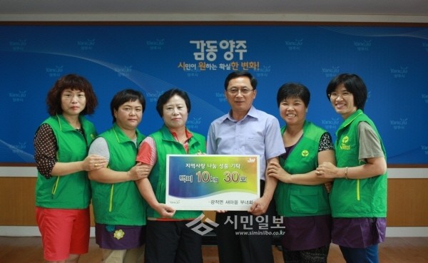 지난 6일 경기 양주시 광적면새마을부녀회는 광적면사무소를 방문해 저소득 소외계층을 위해 백미 10kg 30포를 기부했다. 사진은 관계자들이 기념촬영을 하는 모습.(사진제공=양주시청)