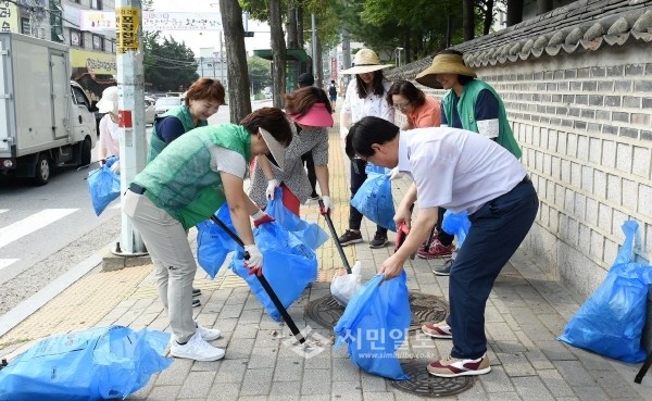지난 6일 경기 광주시는 읍·면·동 전지역에서 공무원, 군인, 민간단체, 지역주민 등 2500여명이 참여한 가운데 '추석연휴 손님맞이 일제대청소'를 실시했다. 사진은 청소 참가자들이 보도 위 쓰레기를 수거하는 모습.(사진제공=광주시청)