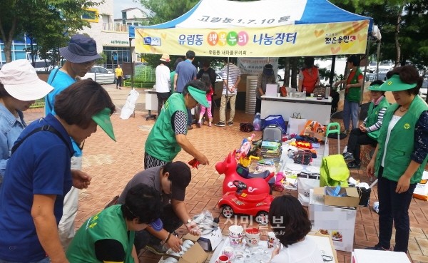 최근 경기 용인시 처인구 유림동은 자원재활용과 나눔문화 확산을 위해 지역주민들이 참여하는 ‘행복누리 나눔장터’를 유방동 어린이공원에서 열었다. 사진은 주민들이 장터에서 물건을 살펴보고 있는 모습.(사진제공=용인시청)