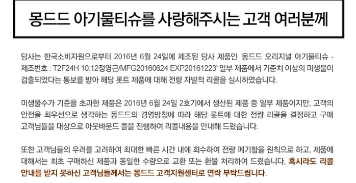 '몽드드 오리지널 아기 물티슈'에서 기준치를 초과한 일반 세균이 검출됐다는 사실이 알려지며 충격을 주고 있다.