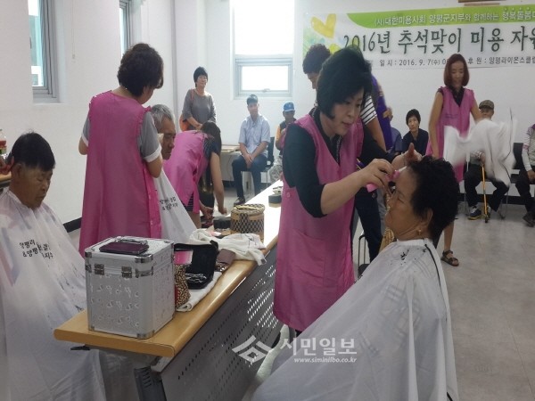 지난 7일 경기 양평군 양평읍은 (사)대한미용사회 양평군지부와 함께 지역의 소외계층 주민 20여명을 대상으로 '미용 봉사'를 실시했다. 사진은 노인들이 봉사자들에게서 미용 서비스를 받고 있는 모습.(사진제공=양평군청)
