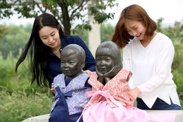 지난 7일 서울 성동구 살곶이공원의 '여울이'와 '가람이' 남매상이 추석을 맞아 고운 한복을 차려입었다. 사진은 한양여대 패션디자인학과 동아리 '패크레' 학생들이 남매상에 직접 만든 한복을 입히고 있는 모습.(사진제공=성동구청)