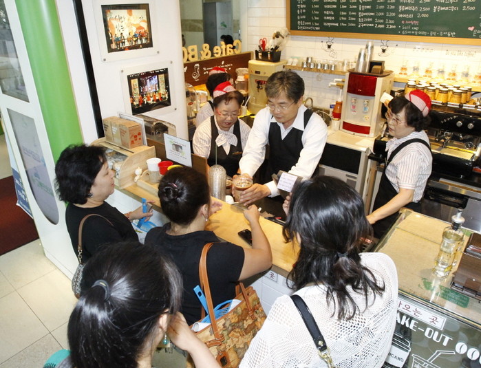 | ▲ 노인일자리 창출 일환으로 문을 연 은평구청내 '은마루 나눔카페'에서 바리스타 봉사활동을 하고 있는 김우영 구청장. | ||