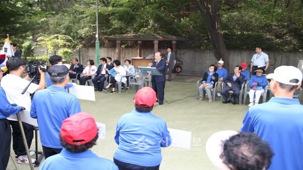 지난 8일 서울 마포구는 망원동 게이트볼장에서 '제26회 마포구청장기 게이트볼대회'를 개최했다. 사진은 대회에 참석한 박홍섭 구청장이 인사말을 전하고 있는 모습.(사진제공=마포구청)