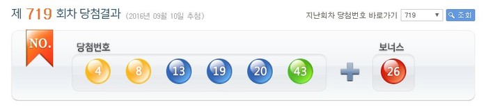 한편 로또 719회차 당첨 번호는 4, 8, 13, 19, 20, 43에 보너스 번호는 26이다.