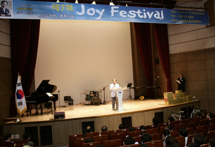 지난 11일 박홍섭 마포구청장은 구청 대강단에서 성산2동중동교동협의회가 주최해 열린 '제7회 조이 페스티벌'에 참석했다. 사진은 박 구청장이 단상 위에서 참가 주민들에게 인사말을 전하는 모습.(사진제공=마포구청)