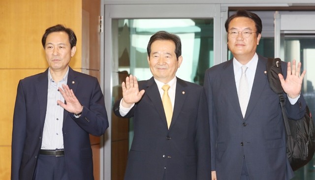 정세균 국회의장(가운데)과 새누리당 정진석(오른쪽) 원내대표, 우상호 더불어민주당 원내대표가 12일 오전 미국으로 출국하기 위해 인천공항 의전실을 나서고 있다.