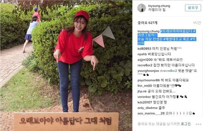 정인영은 15일 자신의 인스타그램에 "#오래보아야아름답다 #과연그럴까 오늘 의상 컨셉은 #해병대조교 혹은 #덕선이"라는 글과 함께 사진을 올렸다. 정인영은 '오래보아야 아름답다 그대처럼'이라는 글의 표지판을 가리키며 카메라를 바라보고 있다.