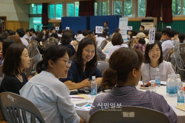 최근 서울 성동구는 무학여고 체육관에서 학생과 학부모, 교원 등 마을 교육 주체 210여명이 참여한 가운데 '성동 혁신교육 200인 원탁토론회'를 개최했다. 사진은 참가자들이 열띤 토론을 벌이고 있는 모습.(사진제공=성동구청)