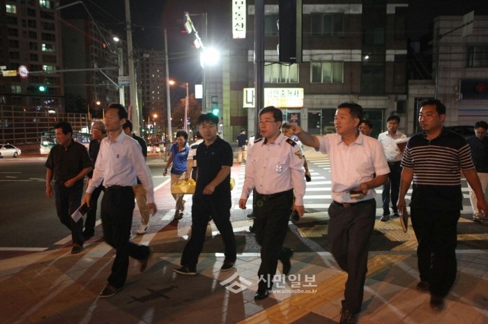지난 12일 경기 수원시 권선구는 세류1동 센트럴타운 일원에서 야간 방범순찰을 실시했다. 사진은 박흥수 구청장(가운데)을 비롯한 방범기동순찰대장, 주민 자치위원장 등 관계자들이 순찰을 하는 모습.(사진제공=권선구청)