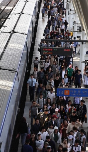 추석 연휴 마지막 날인 18일 오전 서울역에서 귀경객들이 열차에서 내려 밖으로 나서고 있다.