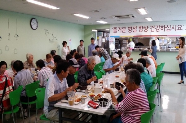 최근 충남 아산시 온양3동 행복키움추진단은 롯데마트 아산터미널점과 연계해 한가위 명절을 맞아 지역내 저소득 홀몸노인들을 위한 식사제공과 물품후원을 실시했다. 사진은 행사에 참여한 노인들이 식사하는 모습.(사진제공=아산시청)