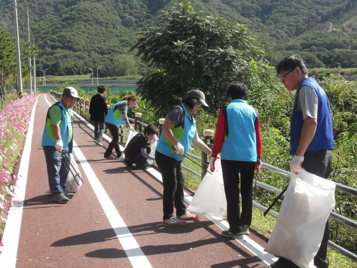 최근 경기 연천군 연천읍사무소는 추석명절을 맞아 하천변·공원·도로변 등 생활주변 곳곳에 버려진 쓰레기를 수거하는 등 국토대청소를 대대적으로 실시했다. 사진은 관계자들이 자전거도로변 청소를 하는 모습.(사진제공=연천군청)