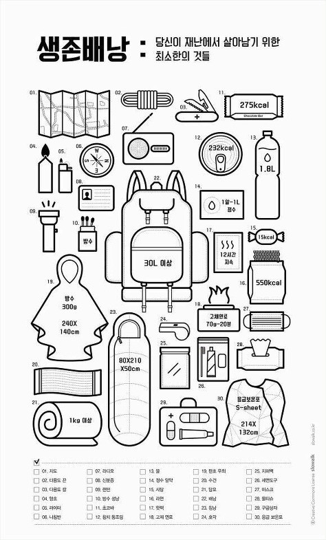 언제 대피해야 할지 모르는 상황에서 최소한의 필수품을 제시한 ‘생존배낭’이 눈길을 끈다. 자료에 따르면 배낭 안에 지도, 끈, 칼, 라이터, 신분증, 수건 등을 챙기는 것이 필요하다.