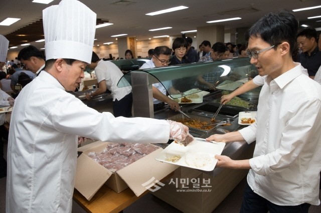 지난 19일 제갈원영 인천시의장은 리모델링을 마치고 문을 연 시청 구내식당 오픈식에 참석해 직원들에게 점심식사를 배식하고 함께 식사하는 시간을 보냈다. 사진은 제갈원영 의장(왼쪽)이 직원들에게 떡을 건네고 있는 모습.(사진제공=인천시의회)
