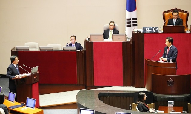 새누리당 김성태 의원이 20일 오전 국회에서 열린 본회의 대정부 질문에서 박인용 국민안전처 장관에게 지진 대응 대책을 질문하고 있다.